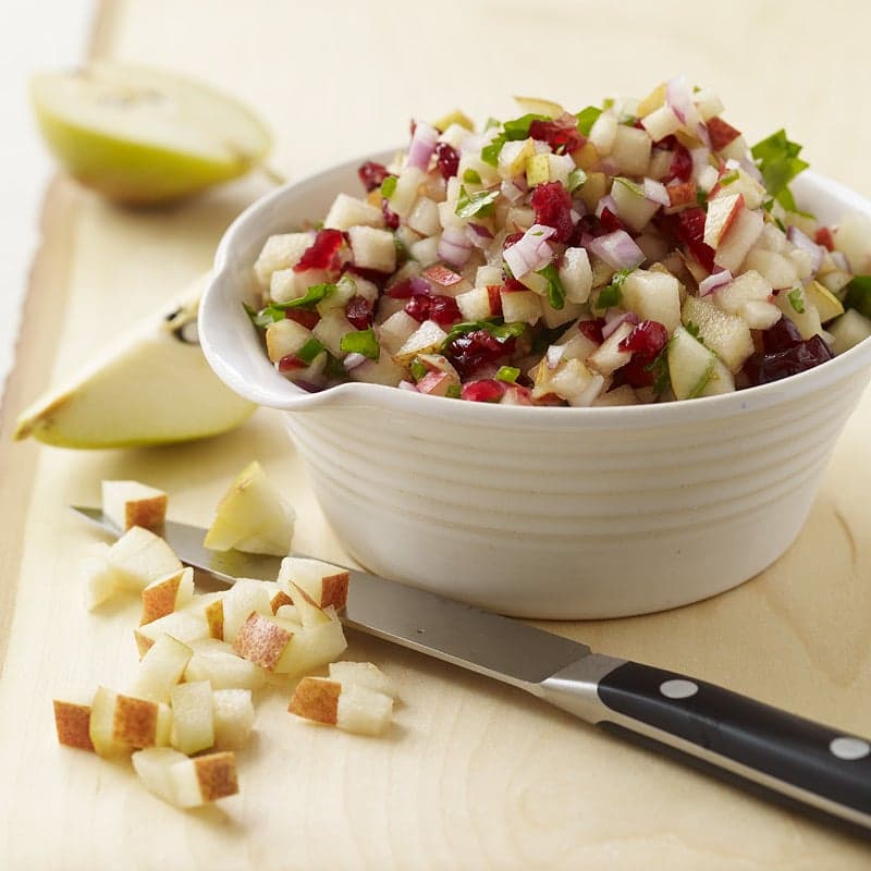 Great served with roasted chicken or pork, this chutney is also a bright Thanksgiving dinner side and delicious turkey sandwich topper. Chop the cranberries so you get the flavor in every bite without having to use as much of the dried fruit. Chutney originated in India as a condiment with a kick of spice added to fruit. Ours features jalapeño peppers for its shot of fire. Chutney's role on the table is to balance a combination of dishes or accent a particular leading flavor. It keeps well in the fridge for up to 4 days with its lime juice base, but squeeze some fresh lime juice over the top before storing to prevent the pears from browning.