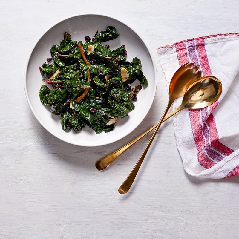 Lemon, currants, and rainbow Swiss chard combine in this colorful side dish that’s ready in about 20 minutes. Rainbow and red Swiss chard varieties have brightly colored stems that retain their color but darken slightly when cooked, but green Swiss chard can be substituted. Swiss chard has a milder flavor than kale and works well with a variety of flavor profiles. When buying it, looks for firm, fresh looking leaves with a vibrant color. If you don’t have a large skillet with a matching lid, use a flat cookie sheet to cover the pan. Remember that both pans will become hot, so use a potholder when handling both.