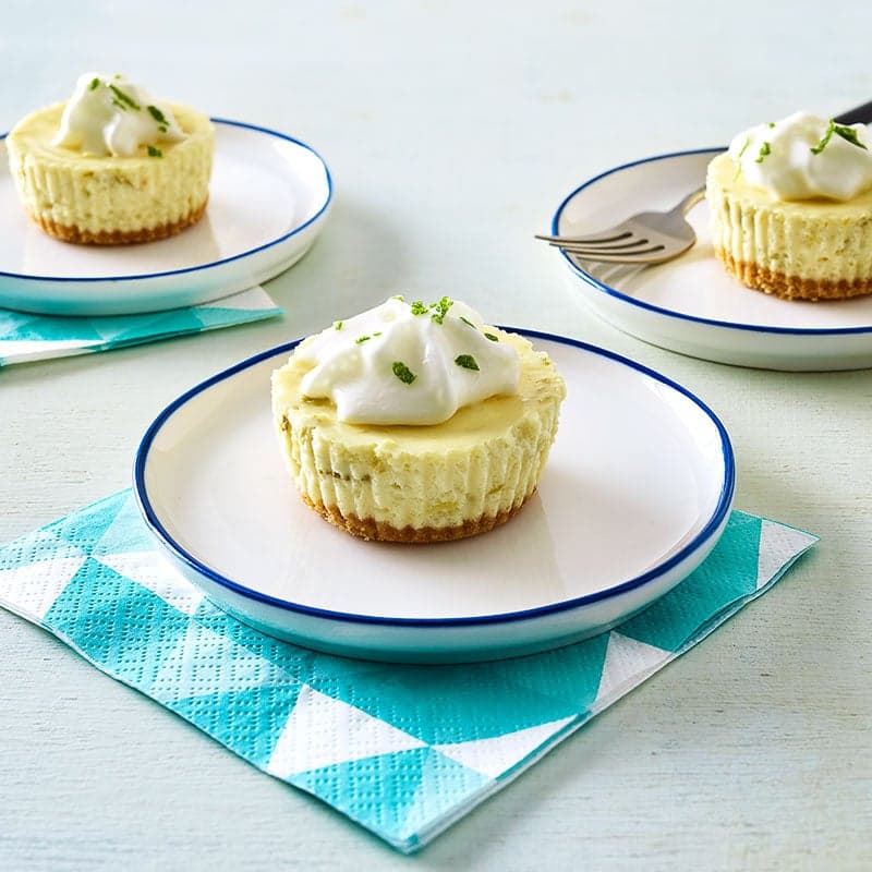 These pretty little cheesecake tarts offer big, bright flavor in a bite-sized package. Key limes are worth seeking out for this recipe—their unique flavor is more tart than traditional and widely-available Persian limes—and the results are worth it. If you can’t find them, you can substitute Persian limes. We’ve used a mix of low-fat cream cheese and a little Greek yogurt to create the cheesecake, which is flavored with both lime zest and juice. It’s poured on a homemade graham cracker crust before going into the oven. The hardest part will be waiting for these cheesecakes to cool before adding on the whipped topping and additional zest.