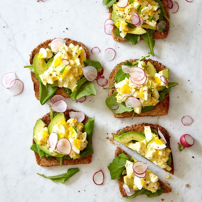 Toast topped with tangy egg salad and creamy avocado makes for a delicious sandwich any time of day. Greek yogurt, fresh tarragon, and crunchy radishes perfectly complement the peppery arugula. Sandwich form or salad form, when you put it all together, you'll soon come to agree with us: this is one delicious egg salad. Keep this recipe on hand any time you need to put a hearty lunch together in just 15 minutes.
