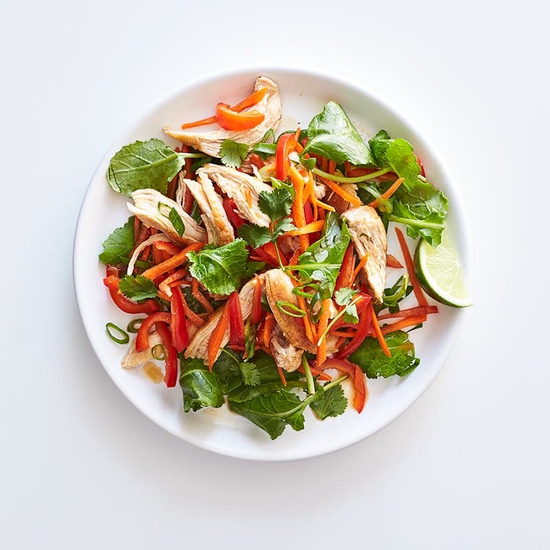 Leftover cooked chicken breast gets an eye-catching makeover in this Asian-inspired salad. Quick and beautiful, this no-cook salad is ready in only 12 minutes making eating-for-one easy and delicious. A simple lunch or light dinner, this quick salad features a dressing of sesame, soy sauce and lime juice, full of salty tang. Taking this to work? Keep the dressing in a separate container until you are ready to eat. If you have fresh broccoli or cucumbers on-hand toss them in the mix for amplified vegetable presence. If you cannot find baby kale use baby spinach or some torn kale.