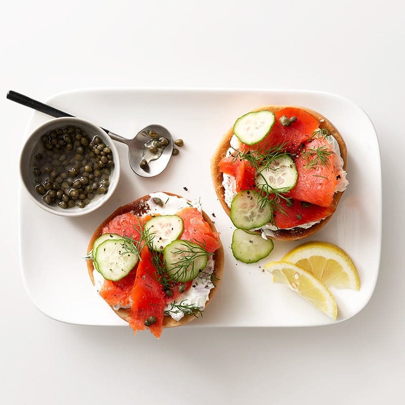 Make your busy morning feel decadent with this delightful five-minute breakfast. Mini bagels are great portion control and toast-up quickly. The classic combination of smokey salmon, dill, cream cheese, briny capers, cool cumbers and the mild bite of shallots make super satisfying toppings and give the whole bagel a fancy feel. Easy to assemble with no cooking needed, you may find yourself making more than one for a wonderful addition to a brunch menu or an afternoon snack. The little bagels are very portable for on-the-go mornings as well.