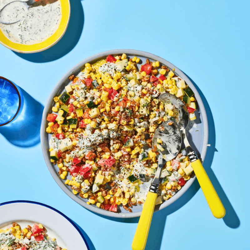 This fiber-rich salad combines fresh summer vegetables and farro with a creamy dill dressing. Out of season, use cooked frozen corn and halved grape tomatoes.