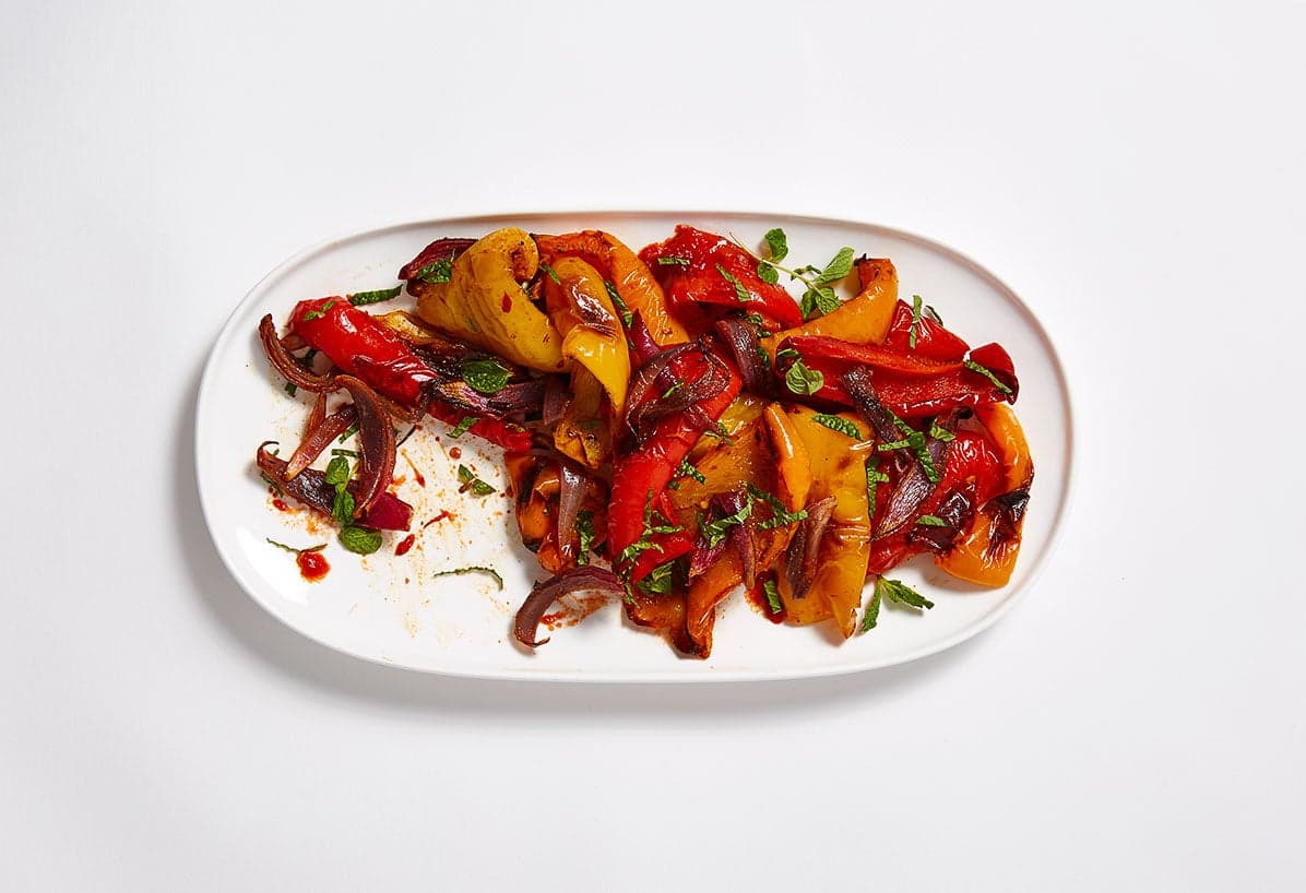 Place peppers and onions in a large bowl and lightly coat with cooking spray; toss with salt, cumin, coriander and pepper. Spread evenly across prepared pans; roast 20 minutes. Stir peppers and onions, and switch pan positions in oven; roast until browned on edges, 20 minutes. Spoon into serving bowl; toss with harissa and garnish with mint.